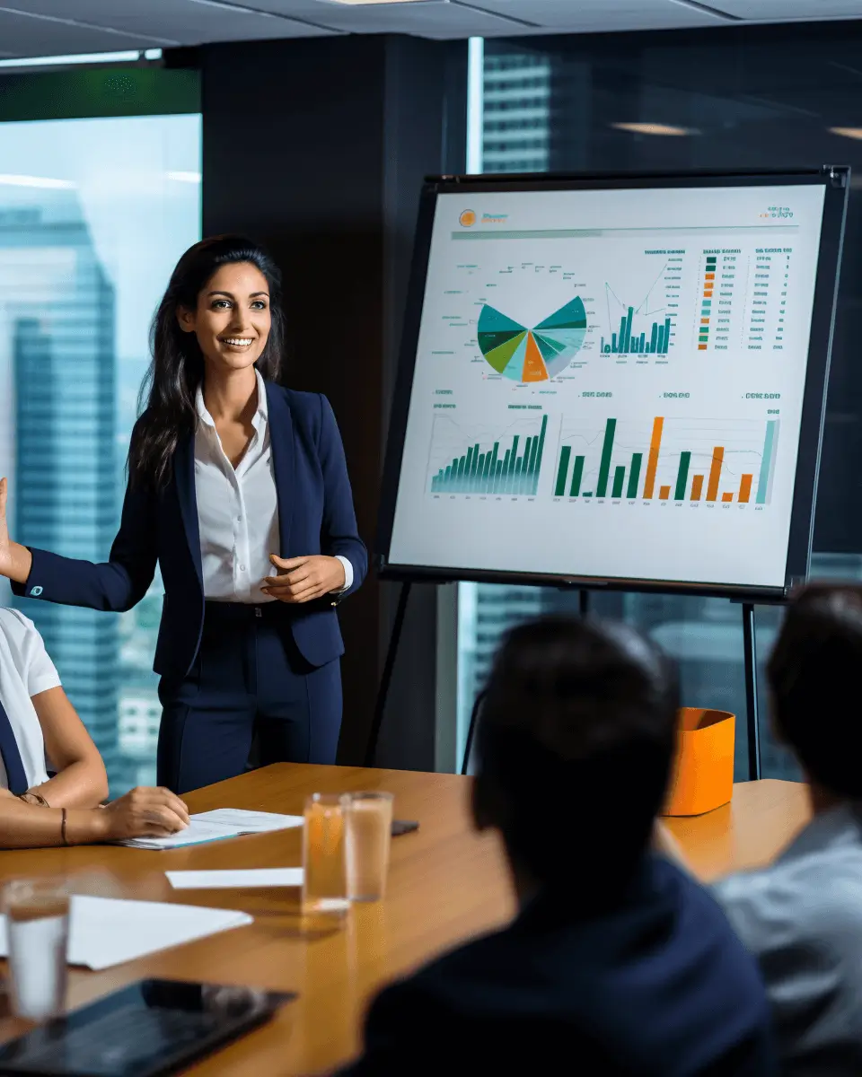 Smiling woman presenting data with confidence.