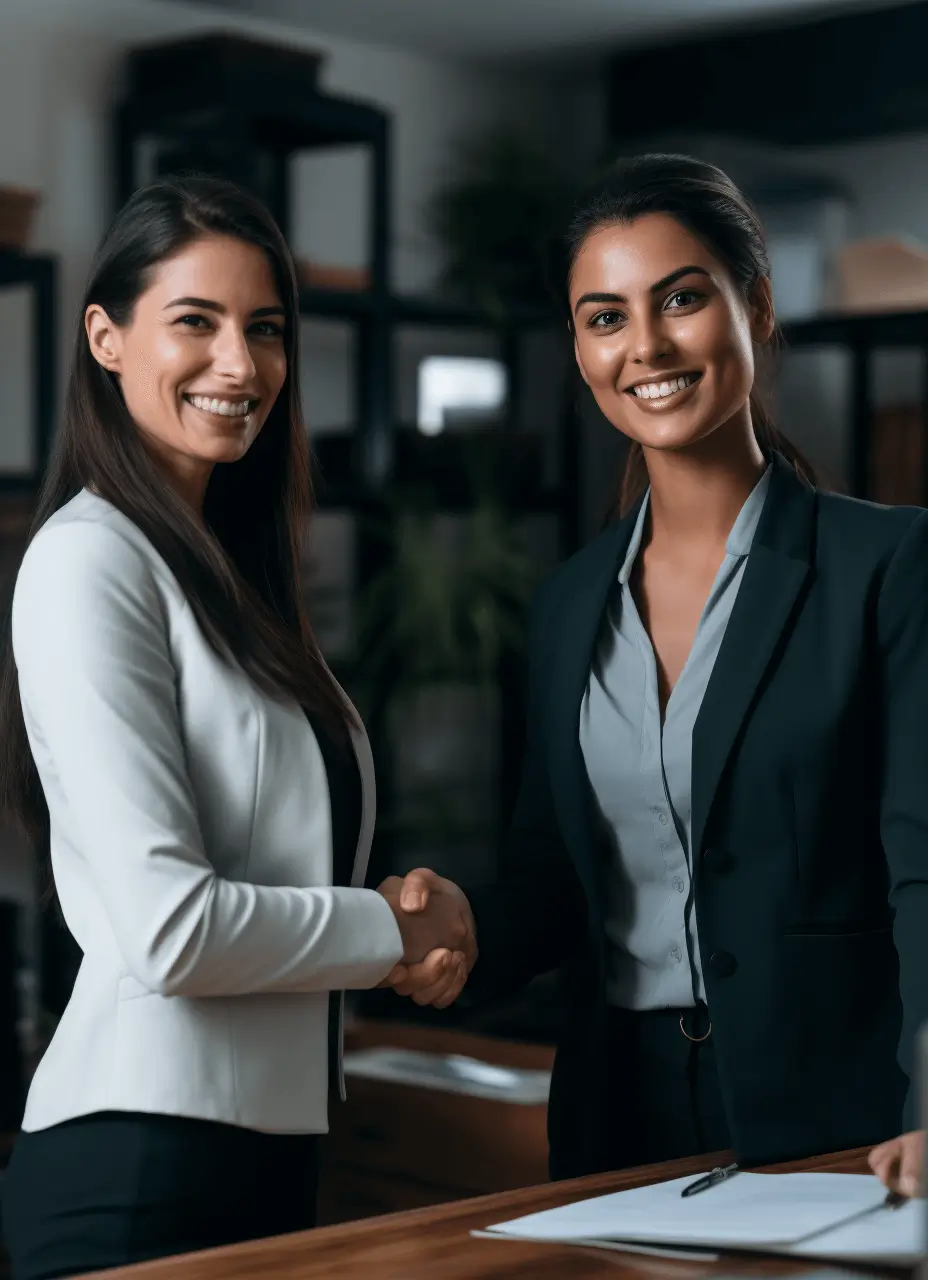 Two businesswomen smiling, shaking hands.